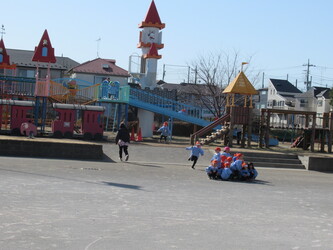 アスレチック広場遊び中は、広くて安全な園庭に避難します。