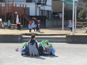 しっかりと先生の話を聞き、防災頭巾を被って、園庭に避難することができました。