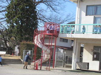 2階ホールで活動していたクラスは、非常滑り台で避難しました。