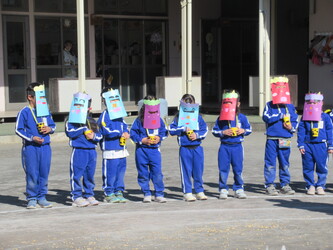 子供たちは、節分製作の時間に作った手作りの鬼のお面や豆入れを身に付け、